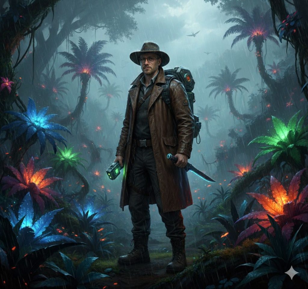 Create a full-body portrait of the person from the reference image me.jpg as a futuristic adventurer in a tropical jungle world dominated by glowing alien plants. She is wearing a weathered leather jacket and staring determinedly into the distance. Photorealistic, dramatic rainforest lighting, Ultra HD.