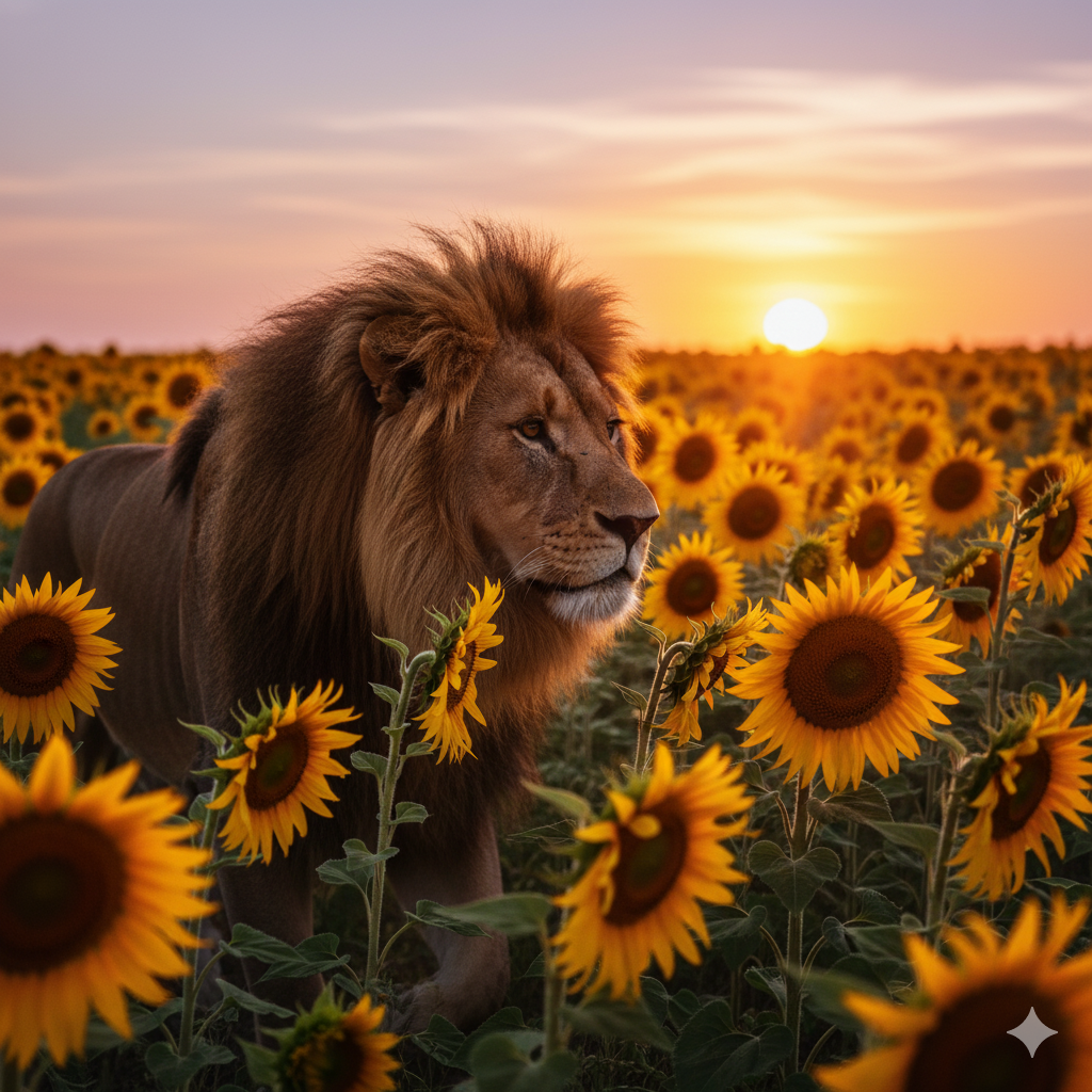 Note the details: the texture of the fur, the light reflections in the lion’s eye, the individual sunflowers illuminated by the setting sun. The image looks as if it were created by a professional wildlife photographer with a great deal of effort – yet it was created in a matter of seconds from a pure text description.