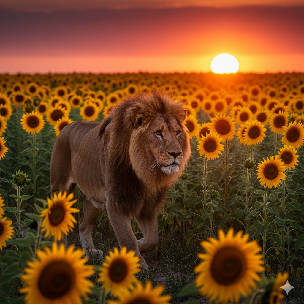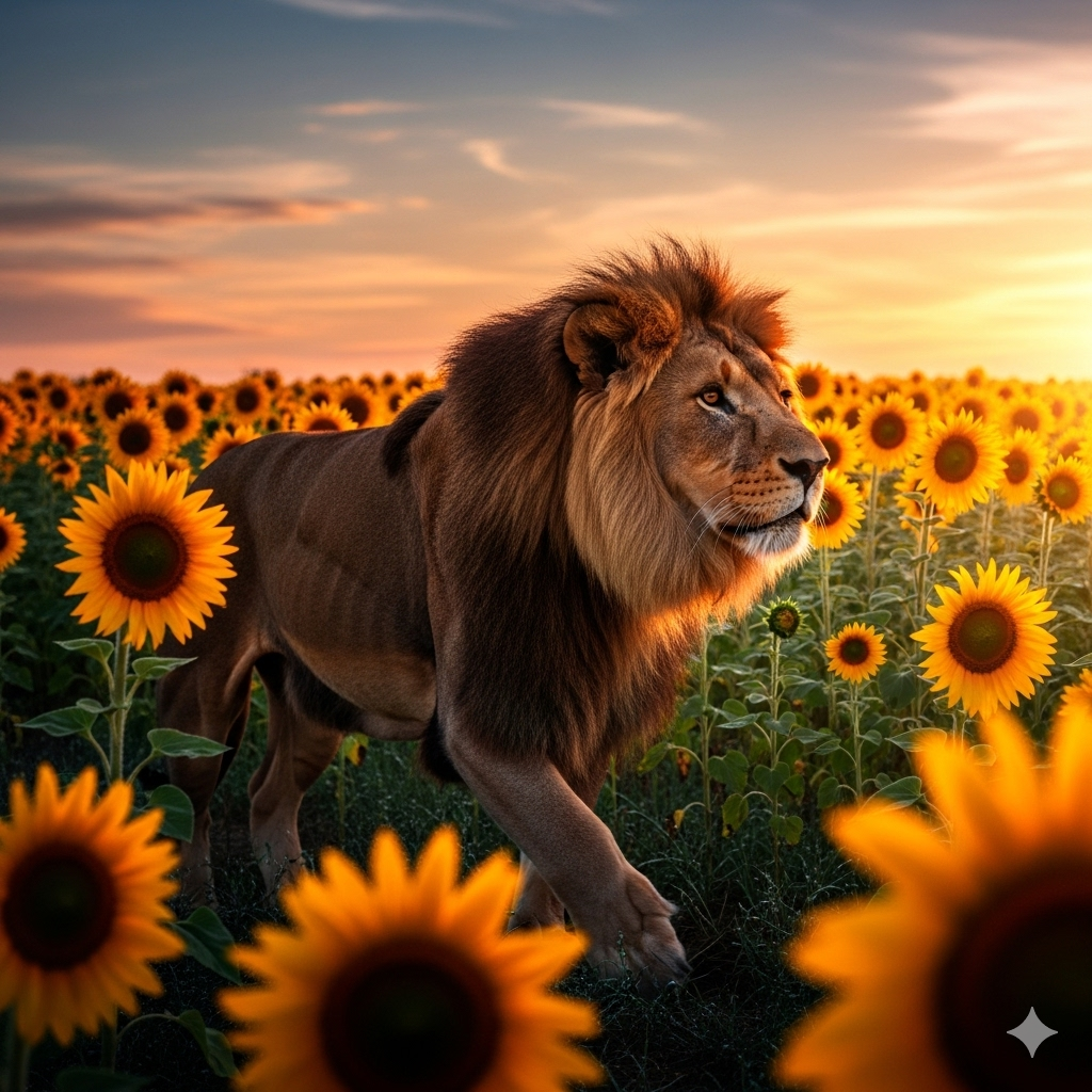 A majestic lion running through a sunflower field at sunset, photorealistic, cinematic lighting, ultra-detailed.